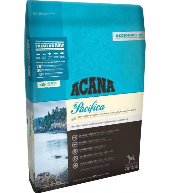 Kiekvienas ACANA receptas nuo pradžios iki pabaigos apgalvotai sukurtas naudojant aukščiausios kokybės ingredientus. ACANA Pacifica recepte net 70 % kokybiškų gyvūninių ingredientų, tokių kaip skumbrės, silkės, jūrų lydekos ir plekšnės. Gyvūniniai ingredientai subalansuoti su šviežiais vaisiais, daržovėmis ir žolelėmis, šie ingredientai sudaro apie 30 %. Mūsų virtuvėje nenaudojami dirbtiniai dažikliai, skonių stiprikliai ar konservantai.