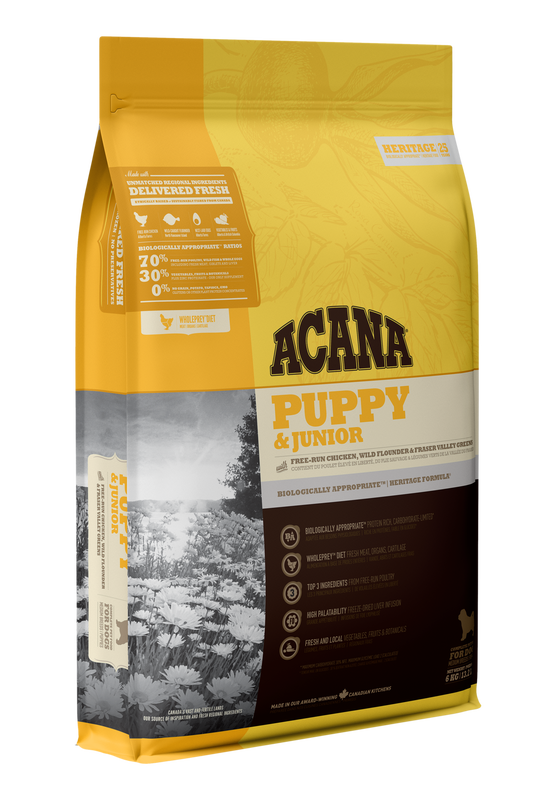 Kai kalbama apie ACANA maistą šunims, kiekvienas ingredientas yra svarbus. Štai kodėl mūsų ACANA Puppy šuniukų receptas yra sukurtas siekiant maitinti visų veislių šuniukus pagal jų prigimtį. Šiame recepte net 70 % kokybiškų gyvūninių ingredientų, tokių kaip šviežia kanadietiška vištiena ir neapdirbtos plekšnės. Gyvūniniai ingredientai taip pat subalansuoti su vaisiais, daržovėmis ir žolelėmis, šie ingredientai sudaro apie 30 %. Receptas yra specialiai sukurtas tam, kad Jūsų augintiniai būtų aprūpinti baltymais ir aukščiausios kokybės ingredientais, kurie yra būtini geram vystymuisi. Visi naudojami produktai yra švieži bei kokybiški.