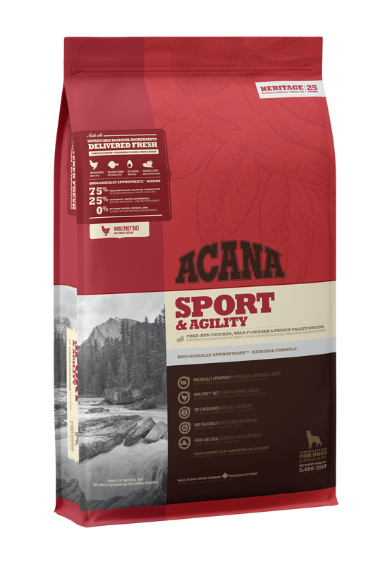 Kai kalbama apie ACANA maistą šunims, kiekvienas ingredientas yra svarbus. Štai kodėl ACANA Sport&Agility receptas sukurtas tam, kad atitiktų visų sportuojančių bei aktyvių veislių poreikius. Šiame recepte net 75 % kokybiškų gyvūninių ingredientų, tokių kaip šviežia kanadietiška vištiena ar neapdirbtos plekšnės. Gyvūniniai ingredientai subalansuoti su vaisiais, daržovėmis ir žolelėmis, šie ingredientai sudaro apie 25 %. Tad šiame recepte gausu gyvūninės kilmės baltymų, kurie būtini aktyviam, judriam augintiniui. Visi ACANA recepte naudojami produktai yra švieži tarsi tiesiai iš ūkininkų turgaus.