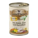 60% mėsa ir šalutiniai gyvūniniai produktai (iš kurių 35% antis, 25% vištiena), 24% paukštienos sultinys, 10% daržovės (bulvės 5%, morkos 3%, žirniai 2%), 5% ryžiai, 1% mineralų.