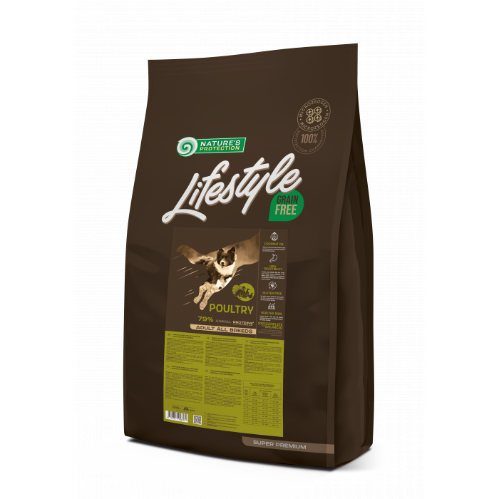 „Nature‘s Protection Lifestyle Grain Free Poultry“ – 100% visavertis, subalansuotas, begrūdis sausas pašaras su aukščiausios kokybės paukštiena (vištiena, antiena ir kalakutiena) ir tyru kokosų aliejumi, skirtas suaugusiems šunims.