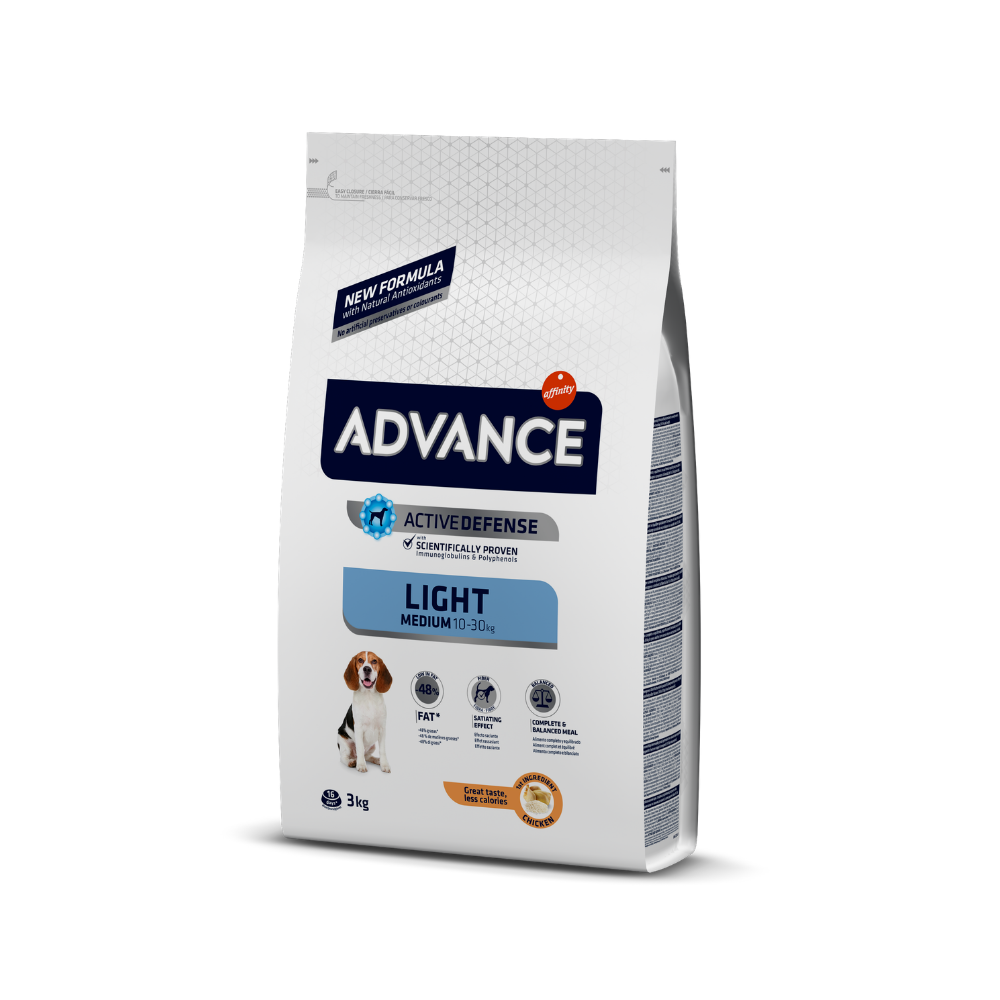 ADVANCE Light Medium ir augstākās kvalitātes produkts, kas īpaši ieteicams vidēja lieluma suņiem (no 10 kg līdz 30 kg) ar lieko svaru vai noslieci uz aptaukošanos. Pateicoties jaunajai “mazāk tauku” formulai un augstajam olbaltumvielu saturam, šī suņu barība palīdz jūsu vidēja lieluma sunim kontrolēt svaru un izvairīties no muskuļu masas zuduma. Advance Light Medium sausā barība ir īpaši pielāgota jūsu pieaugušam vidēja lieluma sunim.