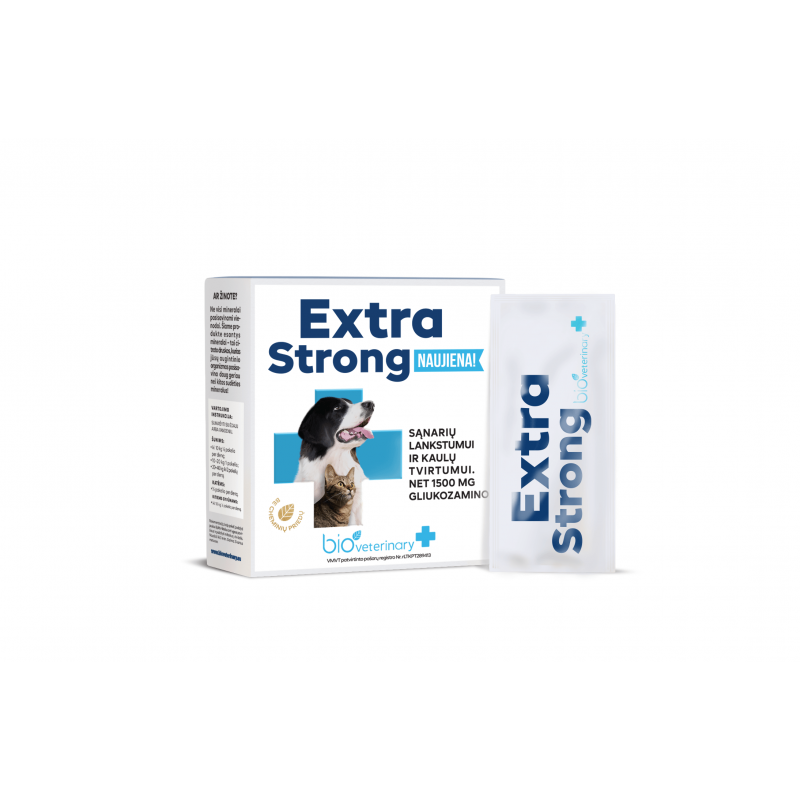 Uztura bagātinātājs mājdzīvniekiem Bioveterinary Extra Strong bez krāsvielām, konservantiem vai garšas pastiprinātājiem. Kastītē ir 28 paciņas.