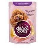 Garšīgas sloksnes ar tītaru un sieru krēmzupā suņiem. Pilnvērtīga konservi pieaugušiem suņiem.