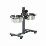 Regulējama augstuma statīvs un divas nerūsējošā tērauda bļodas jūsu mājdzīvnieka barībai un ūdenim.